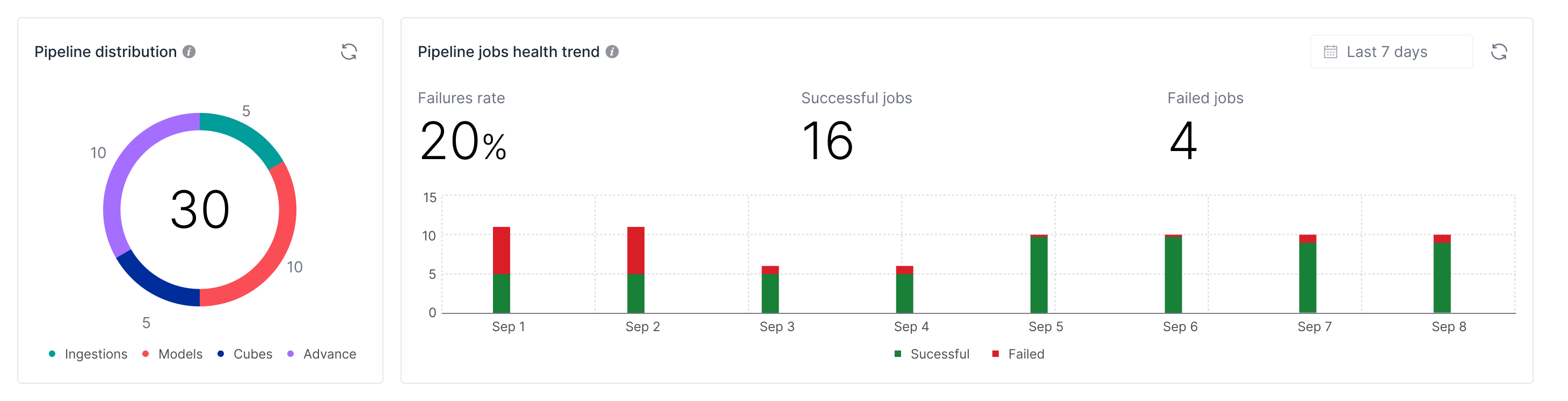 **数据管道类型分布图 / Pipeline distribution** 表示已启用（active）任务的管道总数，按不同类别分布。**管道健康趋势图 / Pipeline health trend** 显示在指定时间范围内的管道任务总数及其状态。