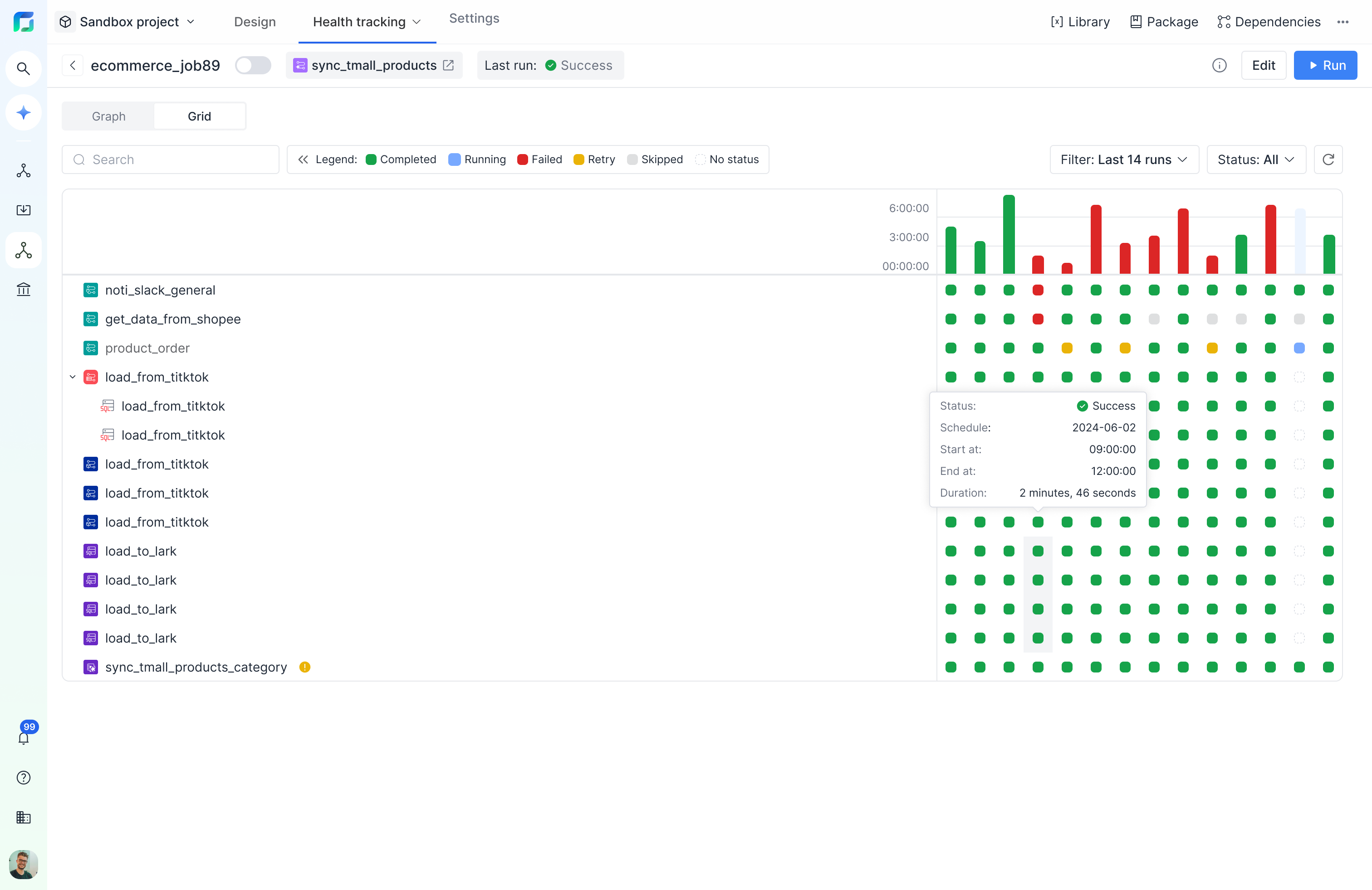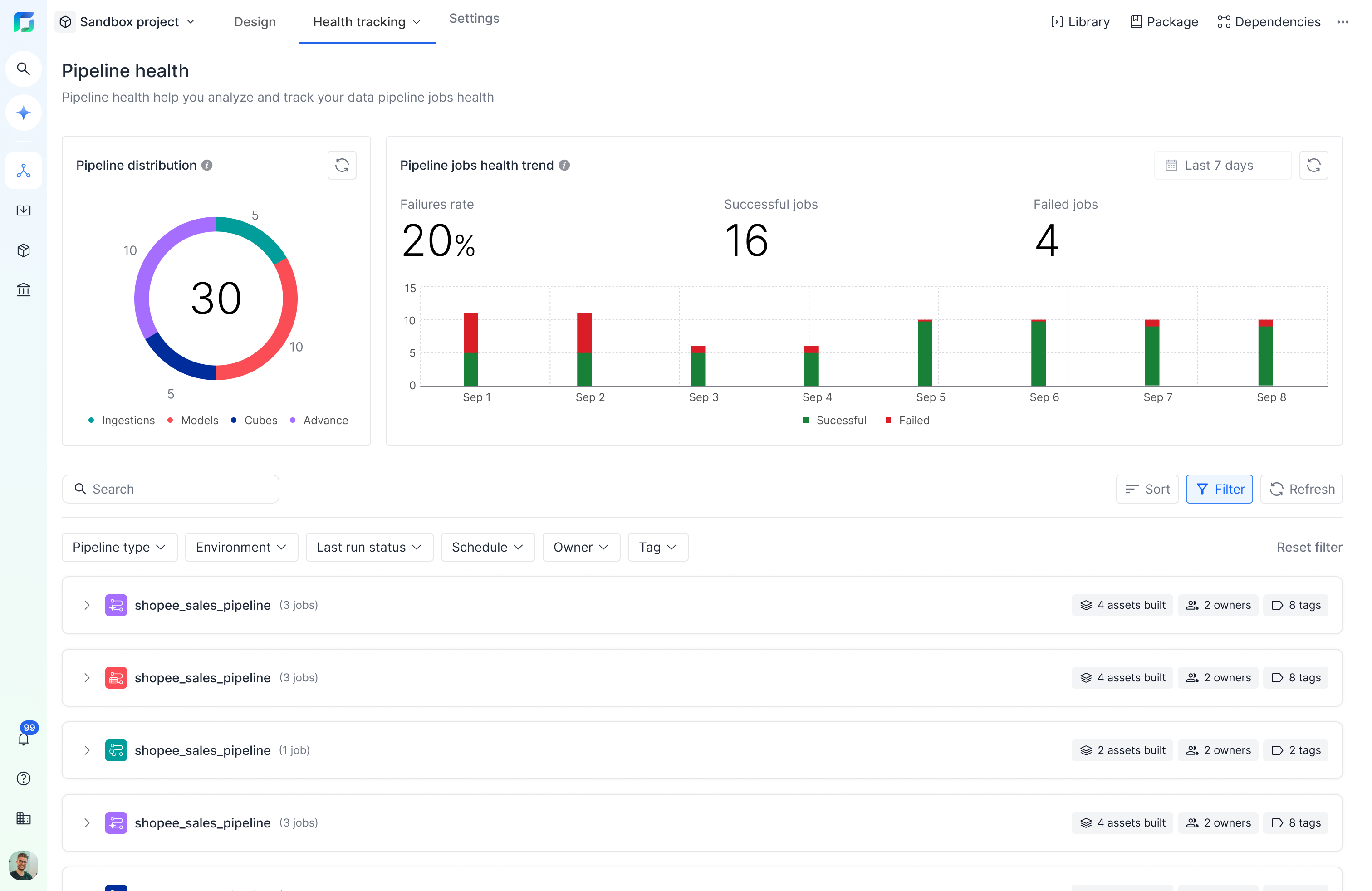 **数据管道健康/ Pipeline Health** 提供了项目范围内所有管道的可视化视图，使您能够高效监控和管理管道和任务。
