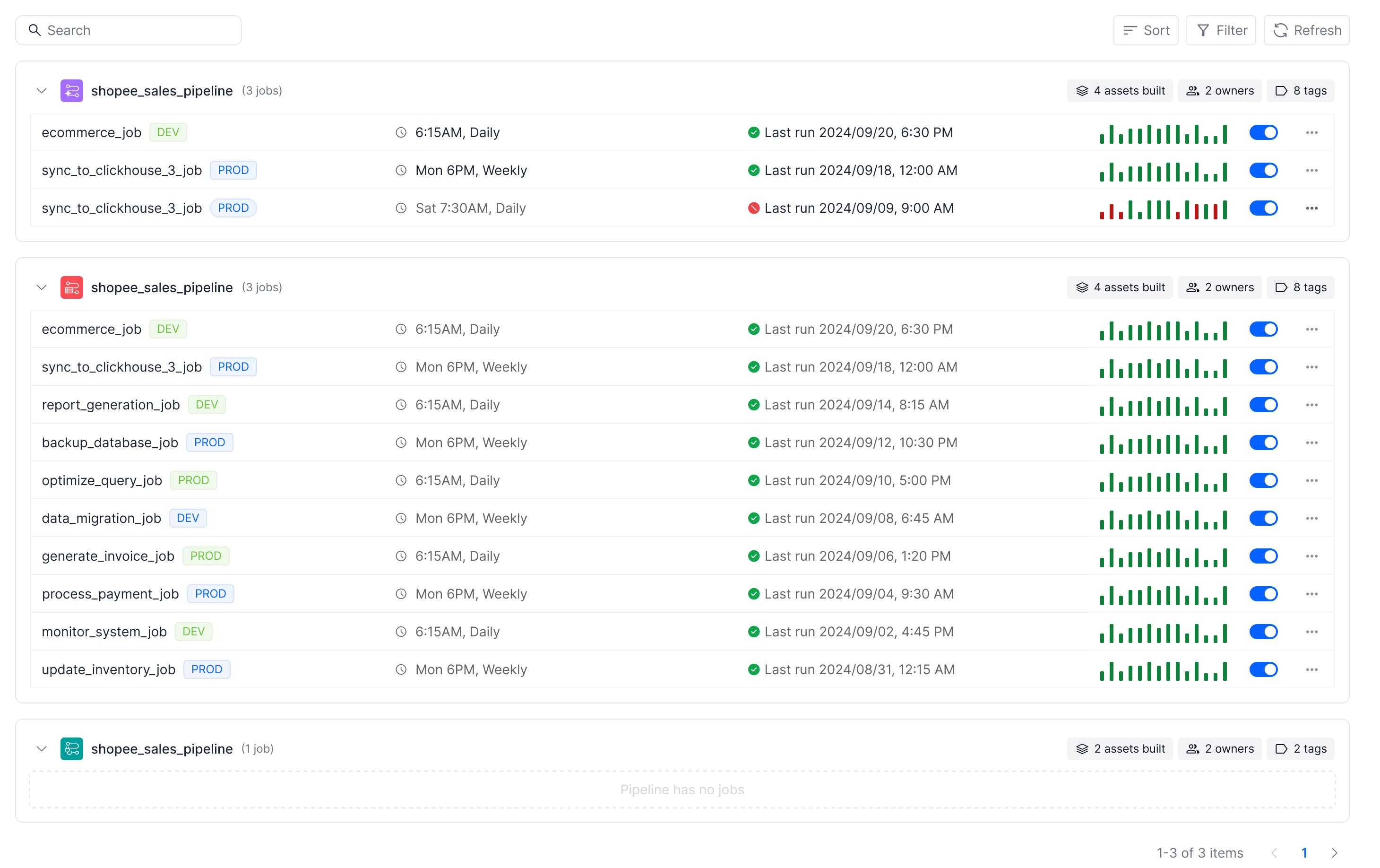 您可以使用顶部的搜索栏从列表中快速搜索管道，排序和筛选功能可以帮助您通过标签、负责人和运行状态的组合来导航和分组管道。
