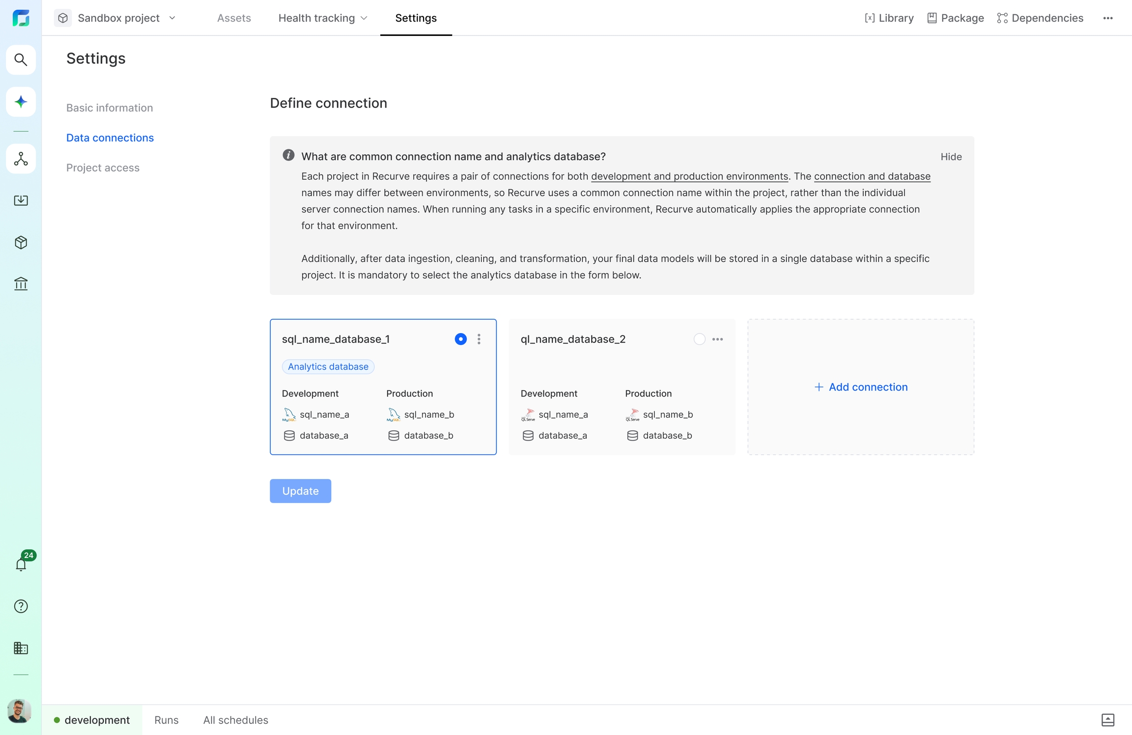 数据连接/Data connections 用于配置在项目中可使用的连接。有关更多详细信息,请参考: 项目连接管理。