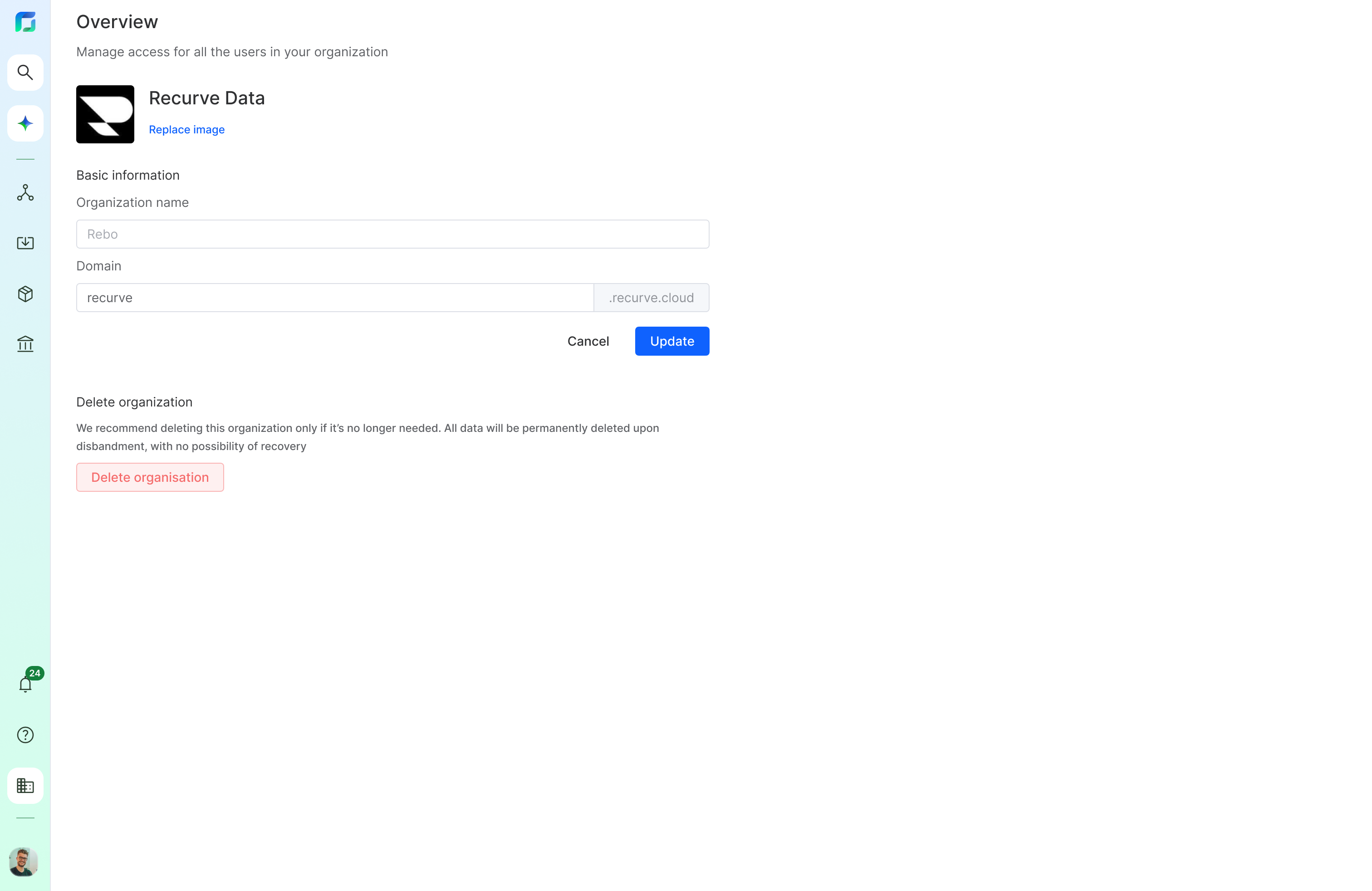 要访问**组织设置/Organization settings**，请在 Recurve 左侧边栏点击 ![](https://content.gitbook.com/content/MNJfiu2Or0lnmkm2x228/blobs/nqTA6hVWkLjnxqlPrNp1/Recurve_organization_icon.jpg) ，选择相应的设置部分。