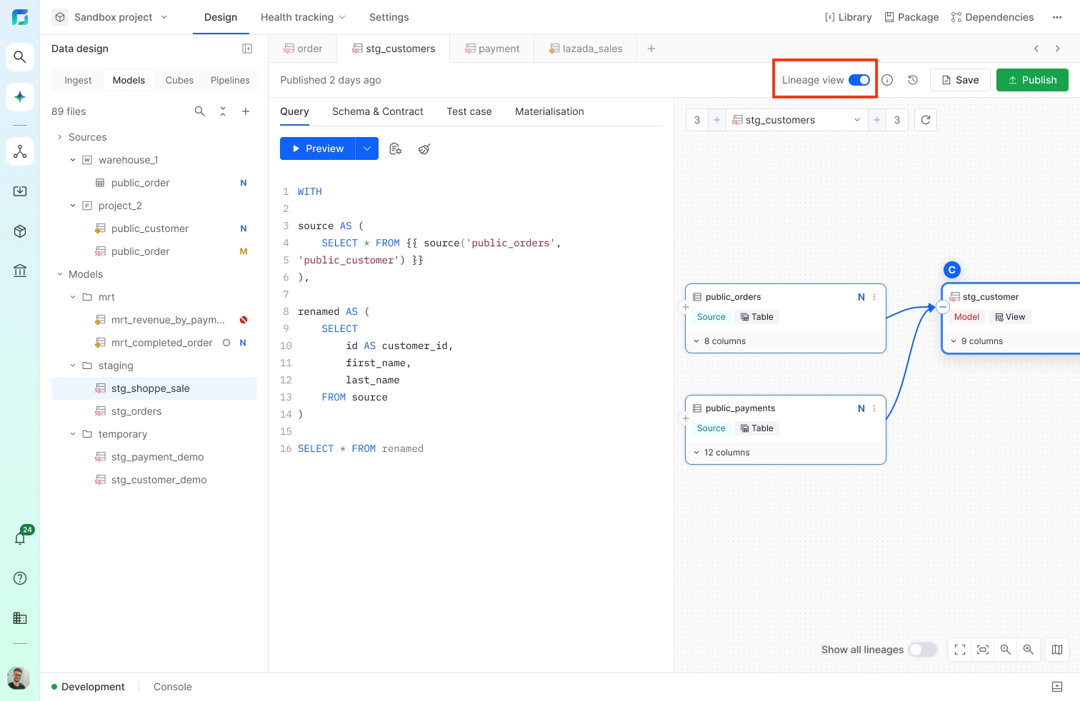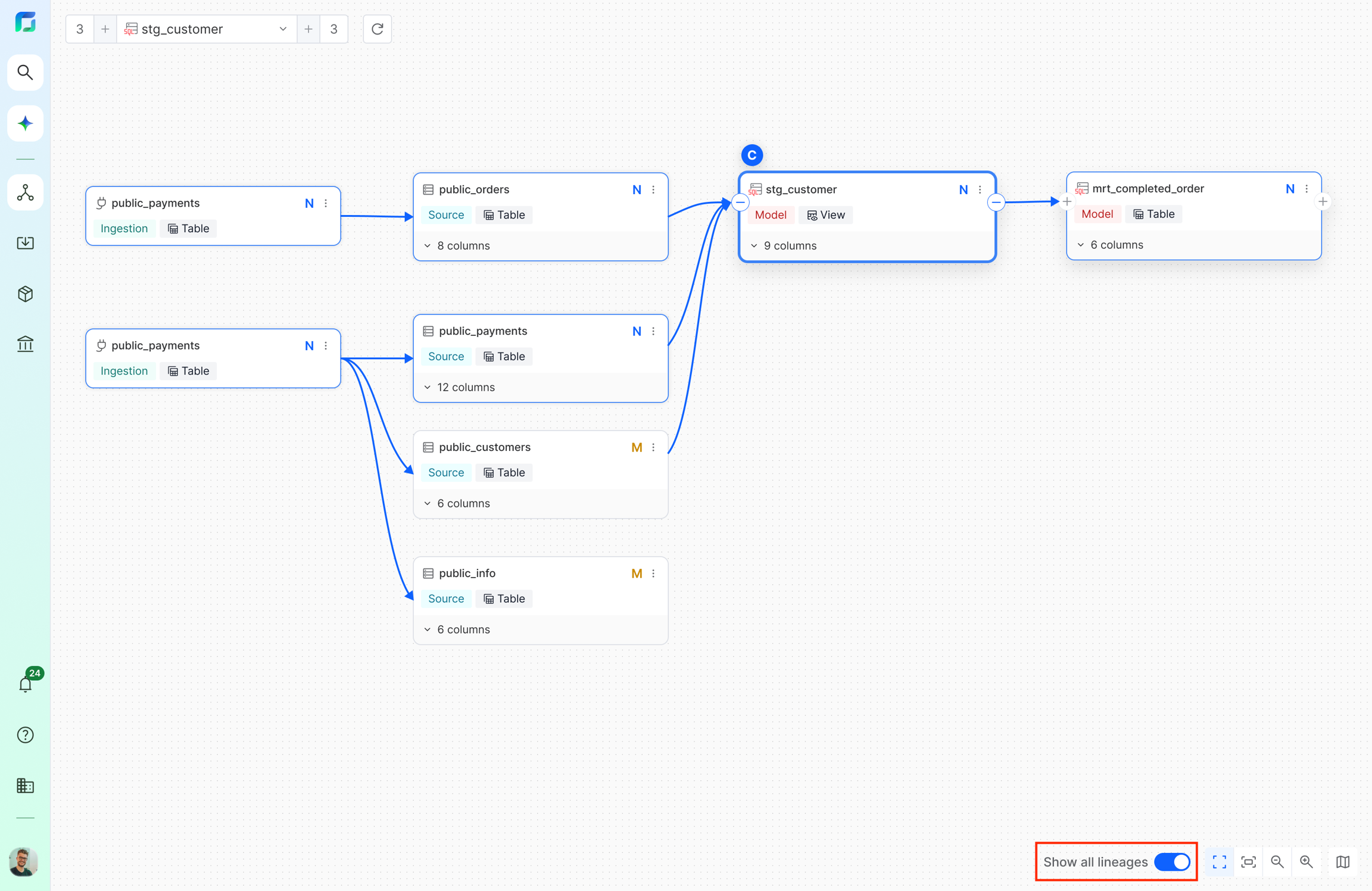 如果你想查看项目中所有资产的完整数据血缘,可以开启 “显示所有血缘/ Show all lineages” 选项。