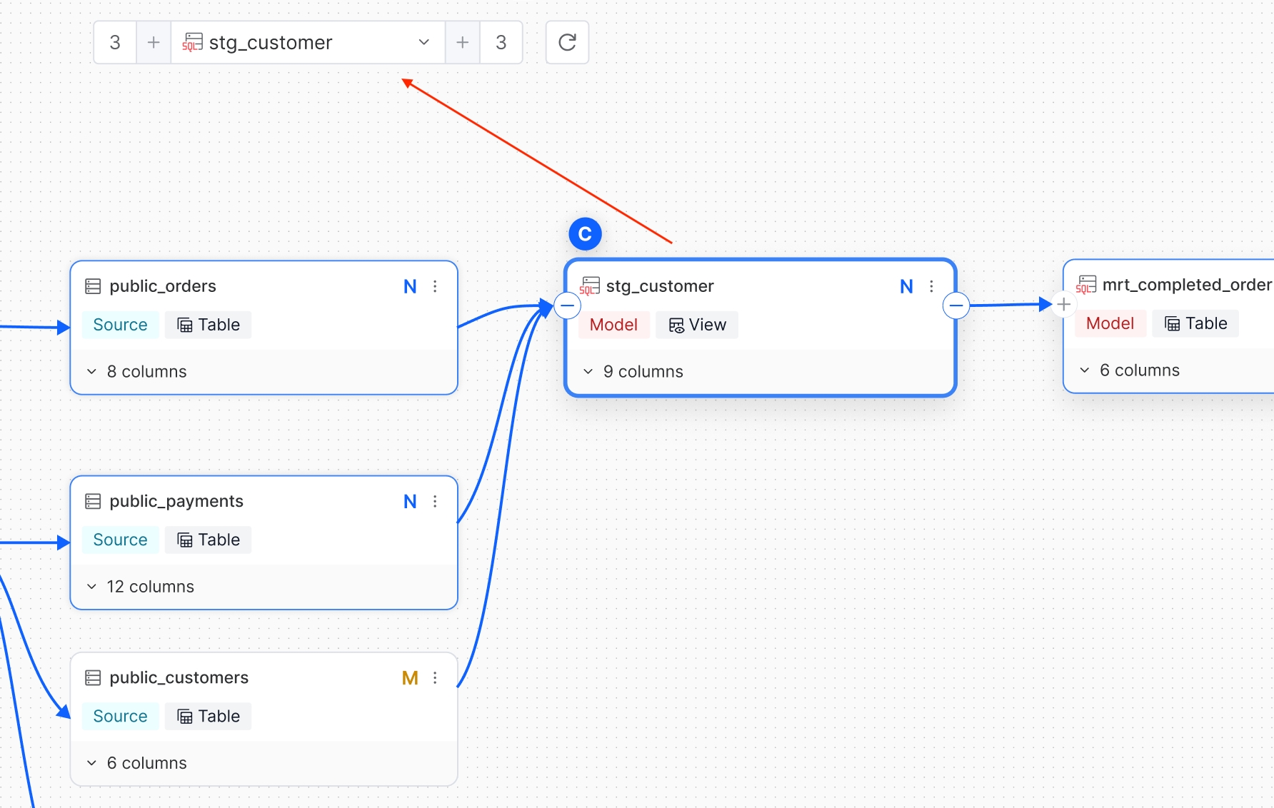 默认情况下,选中的资产/节点会作为中心节点显示。在项目比较大且转换流程复杂时,某个资产可能会有很多关联的节点。通过聚焦一个节点,血缘视图能帮助你查看该资产的信息,以及它与上游和下游模型的关系,从而更好地优化整个转换流程。