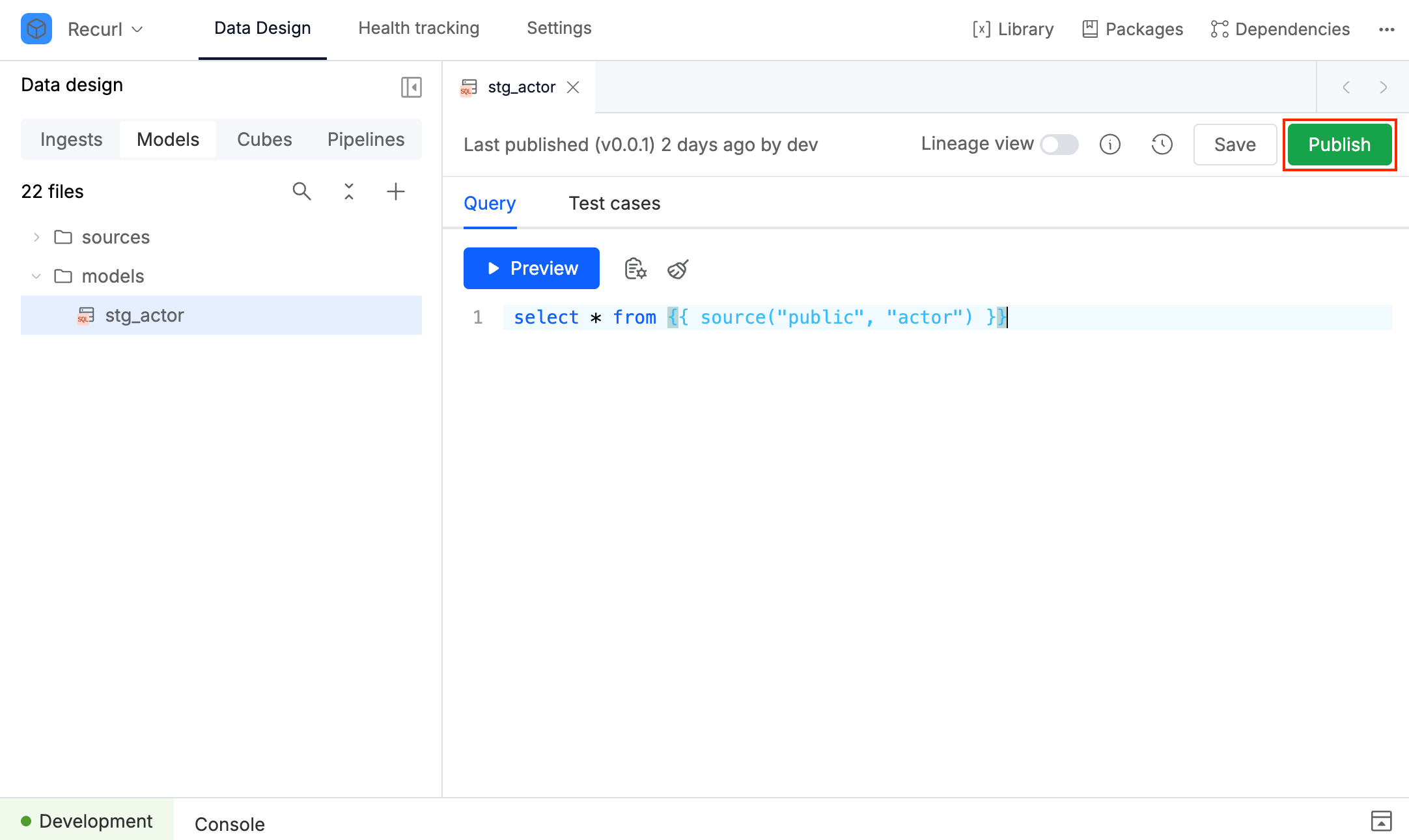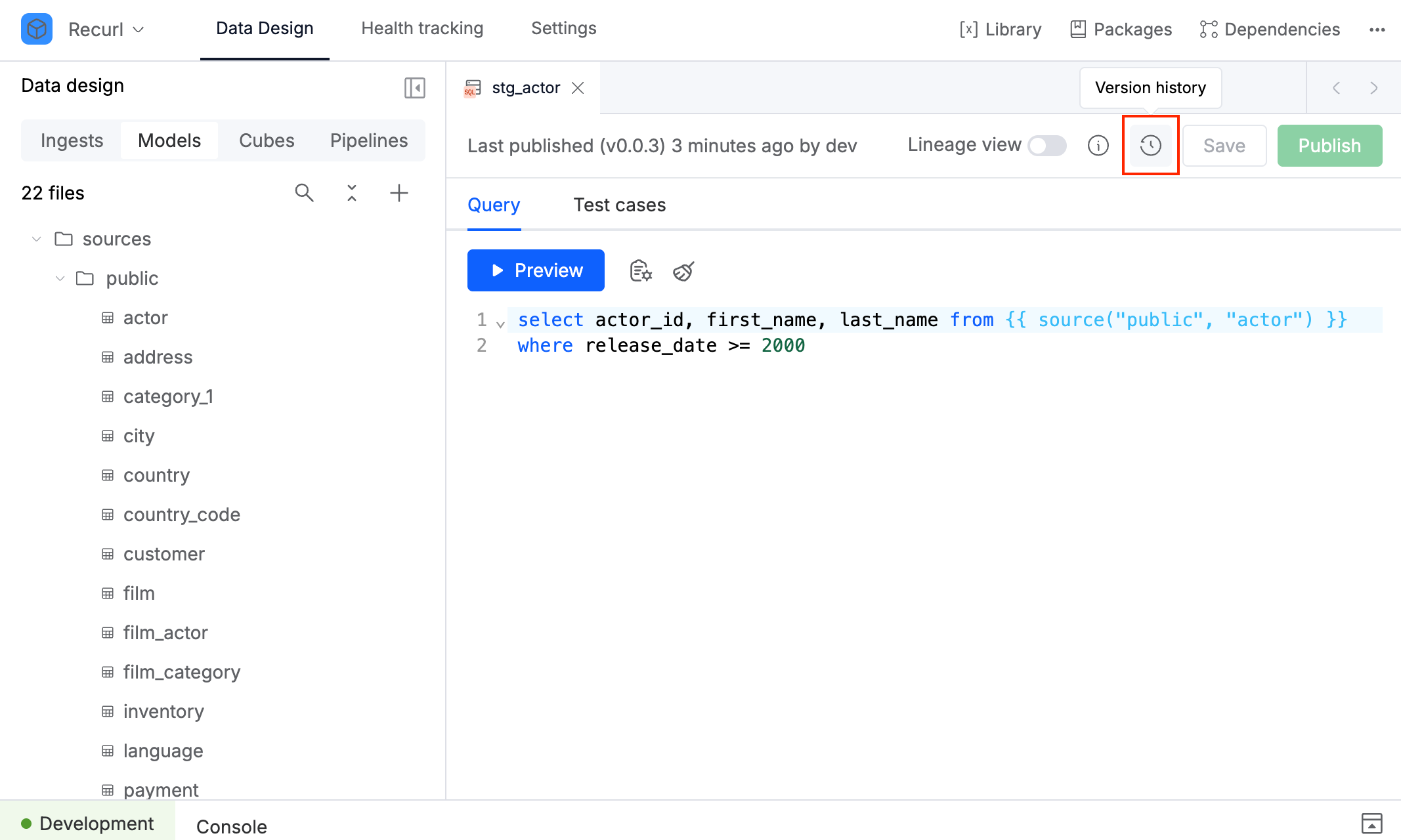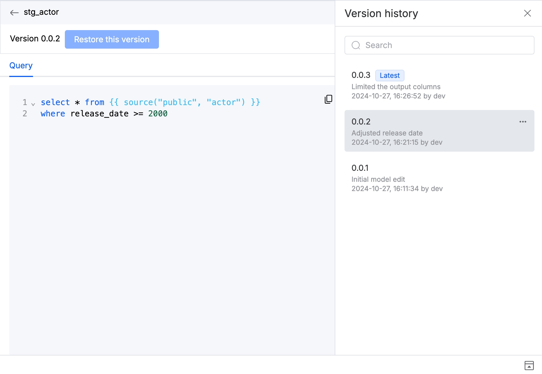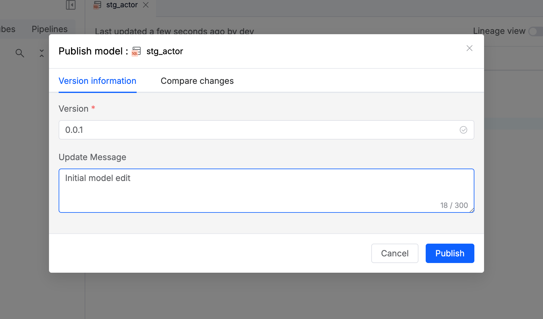 默认情况下,当您首次创建资产(例如模型或数据管道)时,该资产处于 草稿/draft 状态。在对资产做出更改后,您可以发布它,表示该资产已准备好在您的数据工作流中使用。这将创建该资产的一个版本,并将其记录在版本历史中。